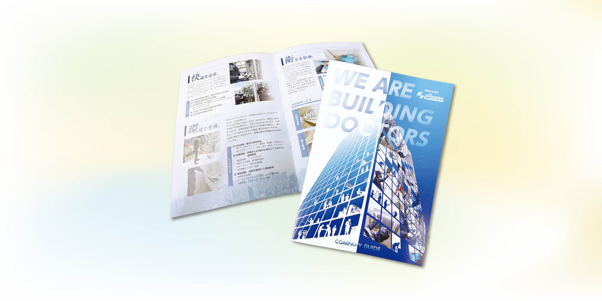 アシスト様のホームページで表現されている、クリーンさ・誠実さのイメージをパンフレットからも感じ取っていただくために全体をブルー系の配色で統一しつつ、作業風景を連想させる写真やイラストを配置しました。ページの左右・項目毎でまとまりを持たせ、読みやすく簡潔に内容が伝わるようなデザインを心掛けました。